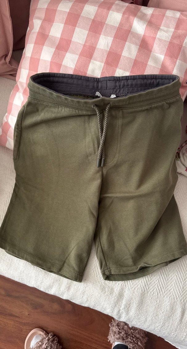 Erkekler çocuk için pamuklu, belden bağlamalı, düz ve desensiz yeşil şort. Sokak tarzına uygun, bol kesim.