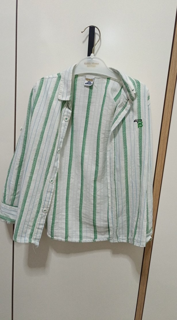 Erkek çocuk için uzun kollu, düğmeli, pamuk kumaştan yapılmış, yeşil çizgili ve notched lapel yakalı bol kesim gömlek. Streetwear tarzına uygun.