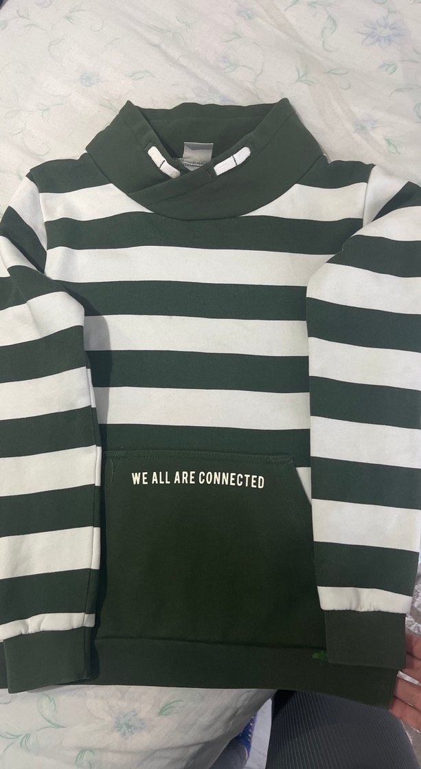 Erkek çocuk için uzun kollu, bisiklet yaka yeşil ve gri çizgili, pamuklu örme kumaştan yapılmış iade yoktur sweatshirt. Ön cepte "WE ALL ARE CONNECTED" baskısı bulunur.İADE YOKTUR