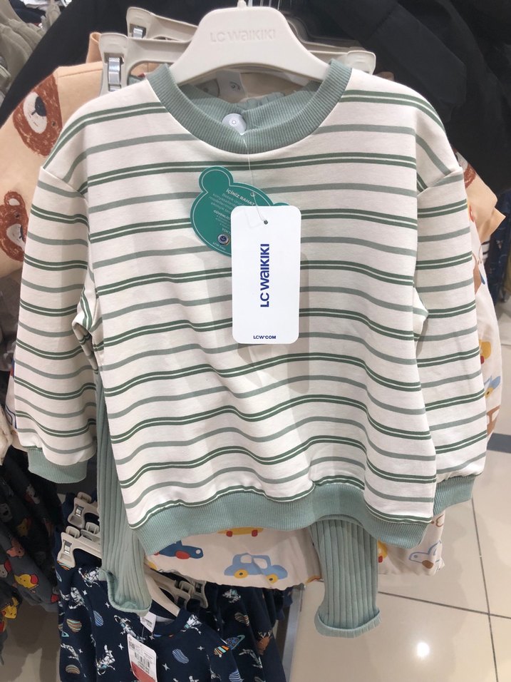 Erkek çocuklar için, uzun kollu, yuvarlak yaka, rahat kesim, pastel yeşil ve beyaz çizgili yumuşak triko kumaştan sweatshirt. Alt üst takım