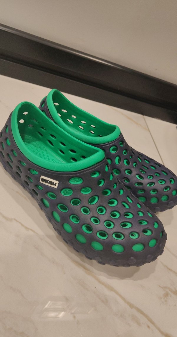 Erkek çocuklar için koyu yeşil ve siyah renk kombinasyonunda, delikli nefes alabilir kauçuk terlikler. Günlük rahat kullanım için şık ve pratik.