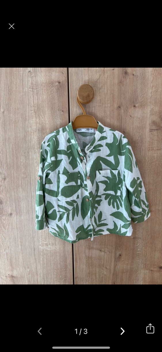Erkek çocuk için bol kesim, uzun kollu, düğmeli ve yakası çıtçıtlı gömlek. Hafif yeşil pamuklu kumaş, bohem desenli. 12-18 aylik