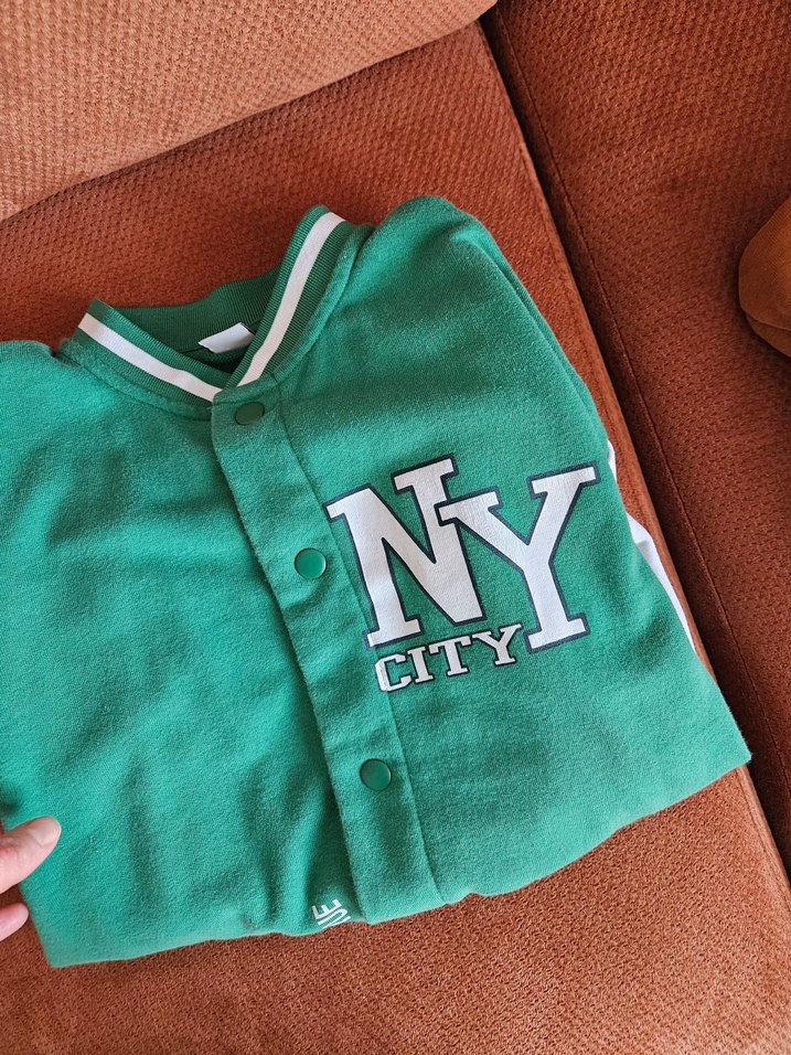 Erkek çocuklar için pastel yeşil, düğmeli, uzun kollu, yuvarlak yakalı, bol kesim sweatshirt. "NY CITY" baskılı, yumuşak ve sıcak kumaştan üretilmiştir. ve tişört