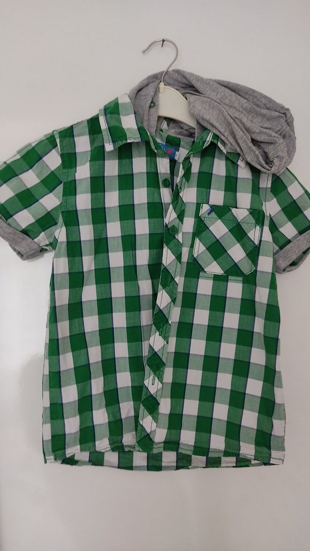 Yeşil ve gri ekose desenli, kısa kollu, düğmeli yakalı erkek çocuk gömleği. Rahat kesim ve ön cep bulunur, sentetik kumaştan yapılmıştır.