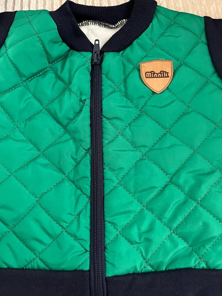 Yeşil renkli, fermuarlı ve fitted kesim erkek çocuk montu. Yumuşak fleece kumaştan, notched lapel yakalı, sade ve streetwear tarzında, "minnik" rozetli.