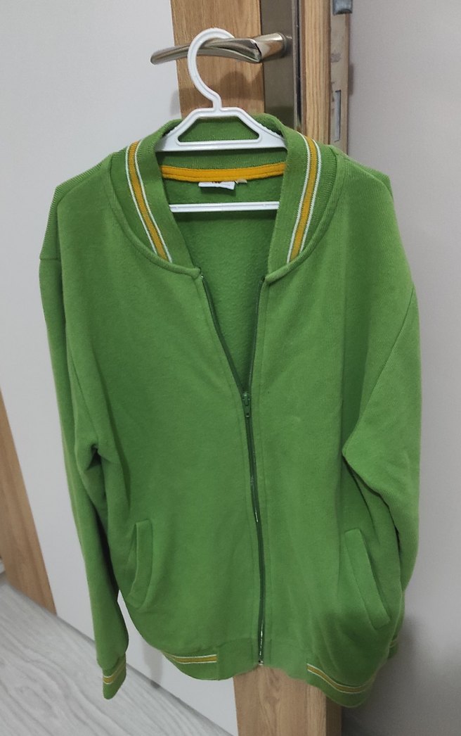 yeşil renkte, fermuarlı ve bisiklet yaka uzun kollu, bol kesim sweatshirt. Yumuşak kumaştan, günlük rahat kullanım için uygundur.