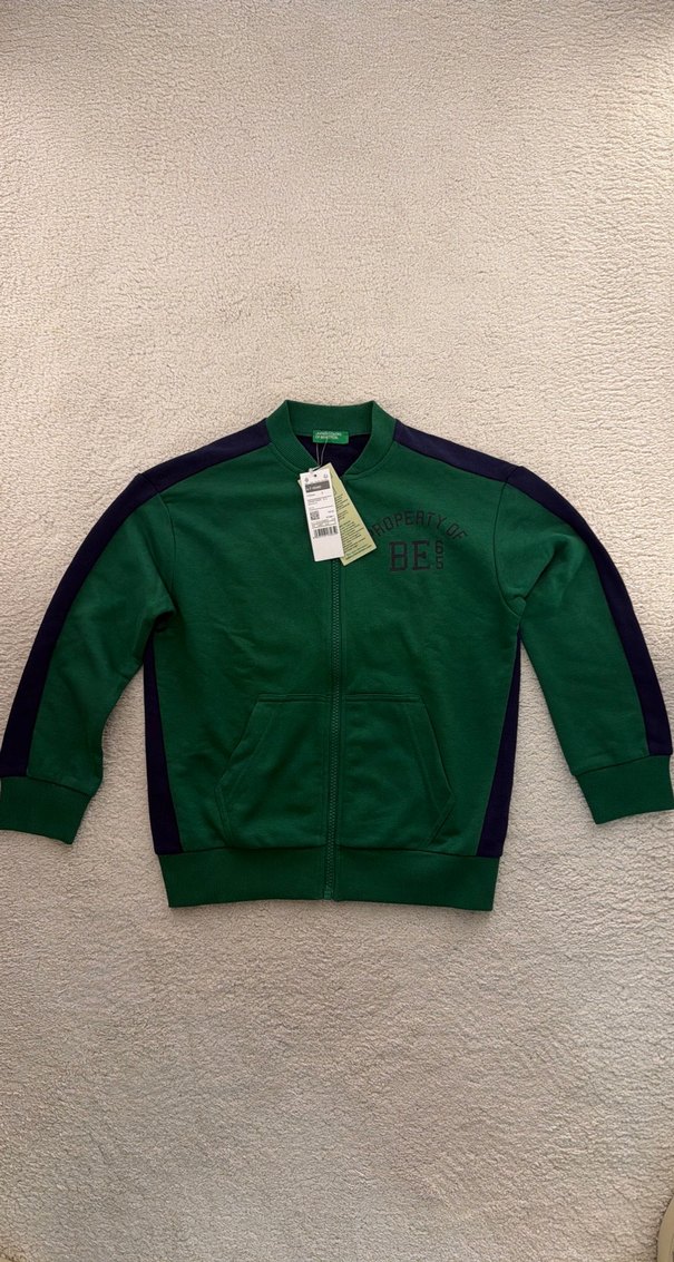 Erkek çocuk için koyu yeşil renkli, bol kesim, uzun kollu ve bisiklet yaka fermuarlı sweatshirt. Yumuşak ve sıcak kumaştan, baskılı detaylı. United colors of Benetton, 6-7 yaş, 122cm
