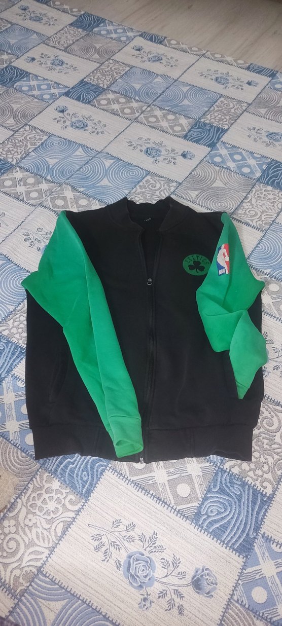 Erkek çocuk için yumuşak kumaştan yapılmış, fermuarlı ve bisiklet yaka, siyah gövde ve koyu yeşil baskılı kollara sahip dar kesim sweatshirt.