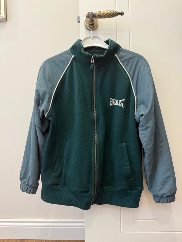 Erkek çocuk için yeşil ve gri renklerde, yüksek yakalı ve fermuarlı, bol kesim ceket. Soft kumaşı ve "EYERIST" yazısı ile dikkat çeker.