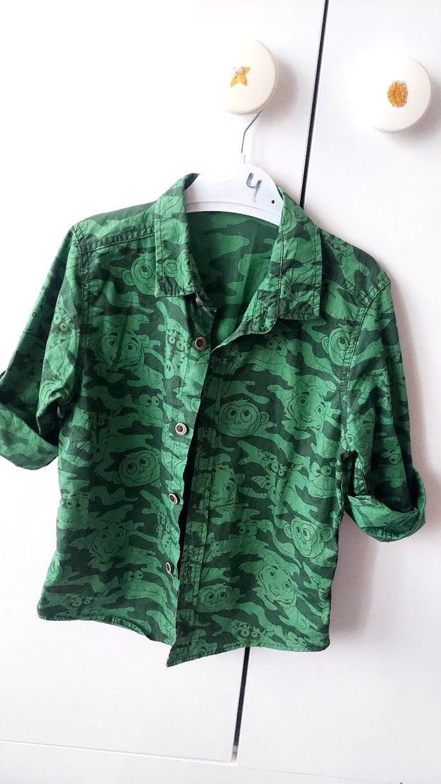 Yeşil parlak kamuflaj desenli, düğmeli, kısa kollu, yakalı erkek çocuk gömleği. Rahat ve bol kesim, sokak stiline uygun.