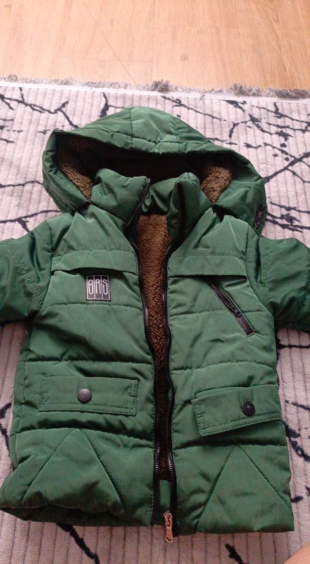 Yeşil renkli, kapüşonlu ve kürk detaylı erkek çocuk montu. Notch yakalı, cep detaylı ve sokak stili için uygun.