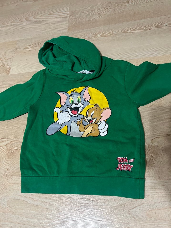 Erkek çocuk yeşil kapüşonlu sweatshirt, Tom ve Jerry renkli baskılıdır. Uzun kollu, fitted kesim ve fermuarlı detaylara sahiptir. Yumuşak kumaştan üretilmiştir. 4 6 yaş h&m marka