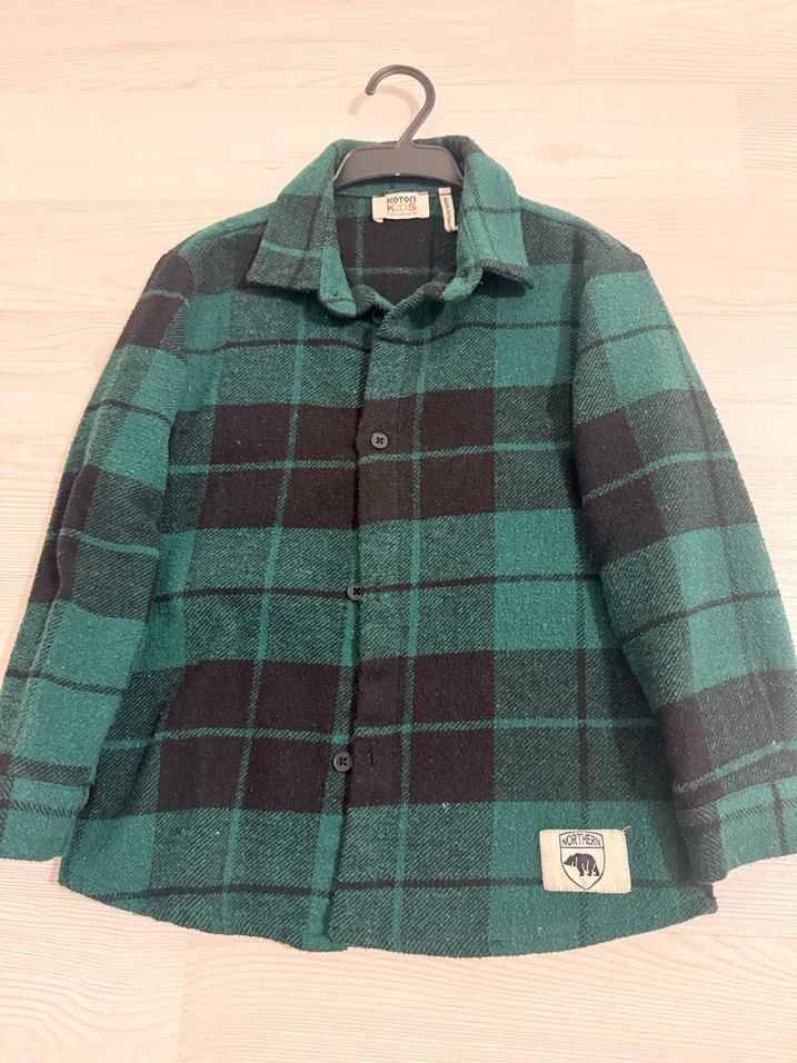 Erkek çocuk için uzun kollu, yaka detaylı, düğmeli ve bol kesim gömlek. Koyu yeşil kareli desene sahip, yumuşak ve sıcak kumaştan üretilmiştir.