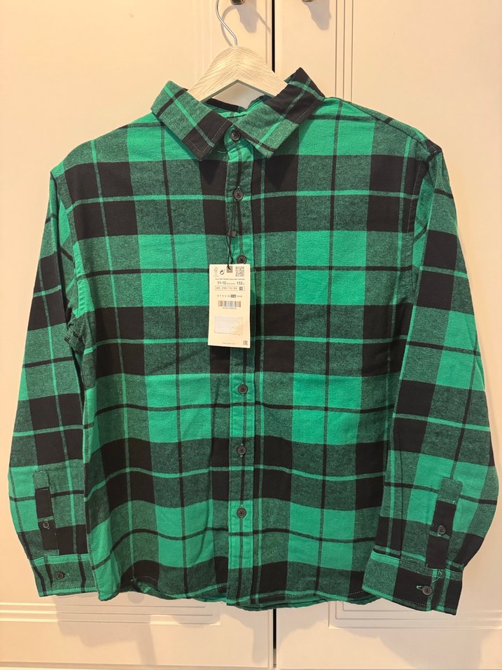 Erkek çocuk için koyu yeşil kareli, yakalı ve düğmeli uzun kollu gömlek. Rahat kesimi ve yumuşak, sıcak kumaşıyla günlük sokak stiline uygun.