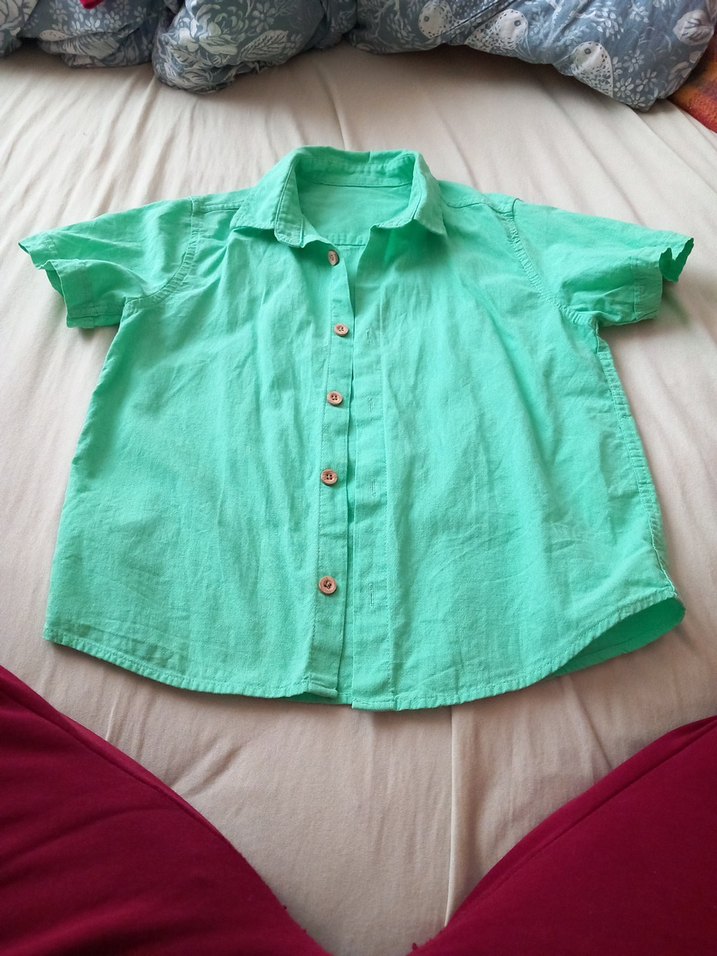 Erkek çocuk için keten kumaştan, düğmeli, kısa kollu ve yakalı, rahat kesim yeşil gömlek.