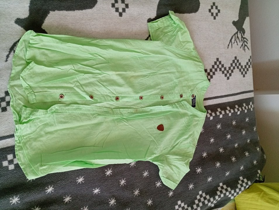 Yeşil keten kumaştan, kısa kollu, yakalı ve düğmeli, erkek çocuklar için renkli ve şık bir gömlek.