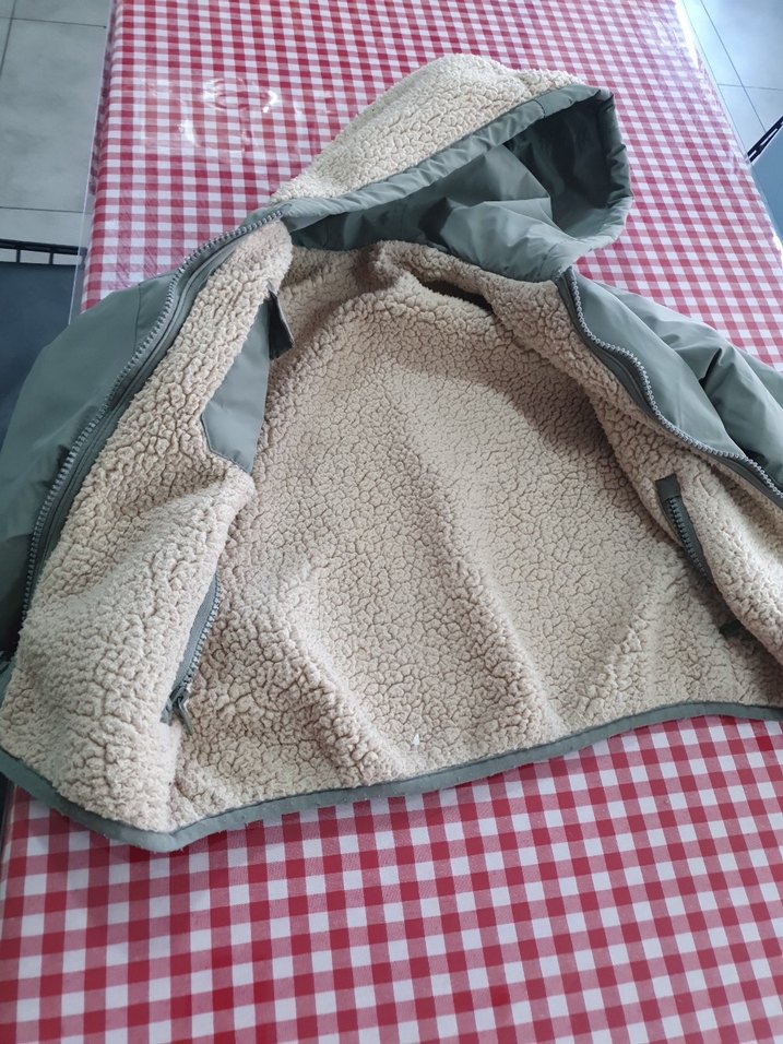 yeşil renkli, kürk detaylı, kapüşonlu, erkek çocuk montu. Notch yaka ve bol kesimiyle rahat bir sokak stili sunar.çift tarafda kulanılır