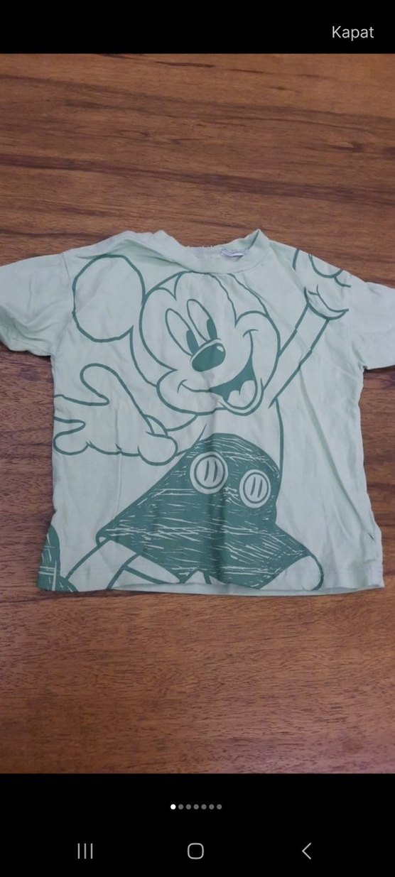 Pamuklu, bol kesim, kısa kollu, bisiklet yaka ve düğmeli erkek çocuk tişörtü. Pastel yeşil renkte, büyük Mickey Mouse baskılı.