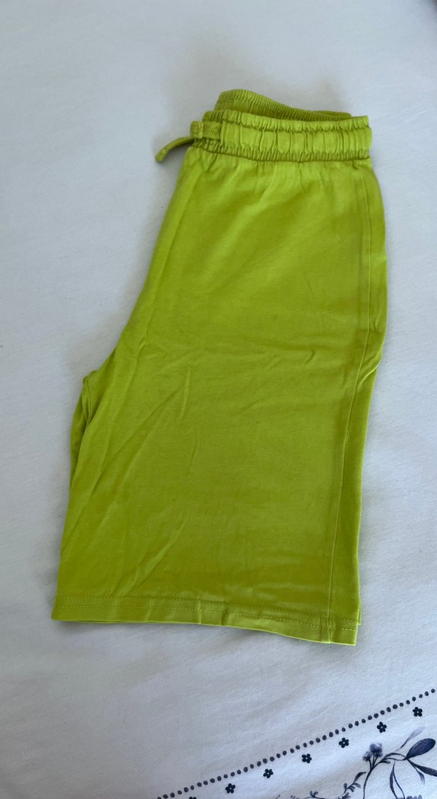 Erkek çocuk yeşil renkte, bol kesim midi şort. Pamuklu kumaştan, günlük sokak stili için uygun. ✨