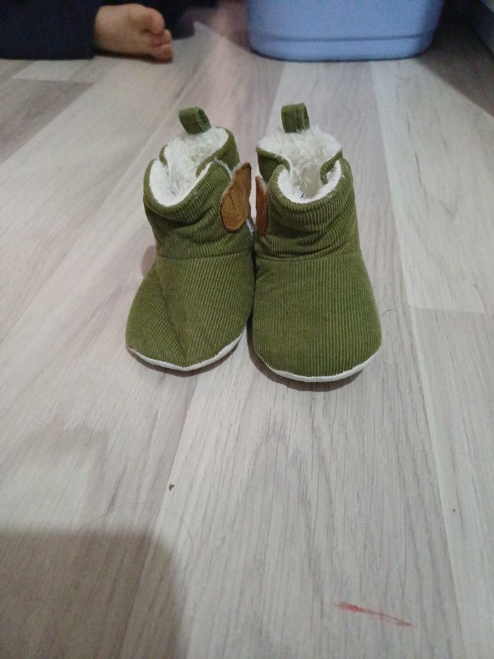 Yeşil örgü erkek çocuk pandufları yumuşak iç astar ile rahatlık ve sıcaklık sağlar. Düz ve desensiz tasarım.