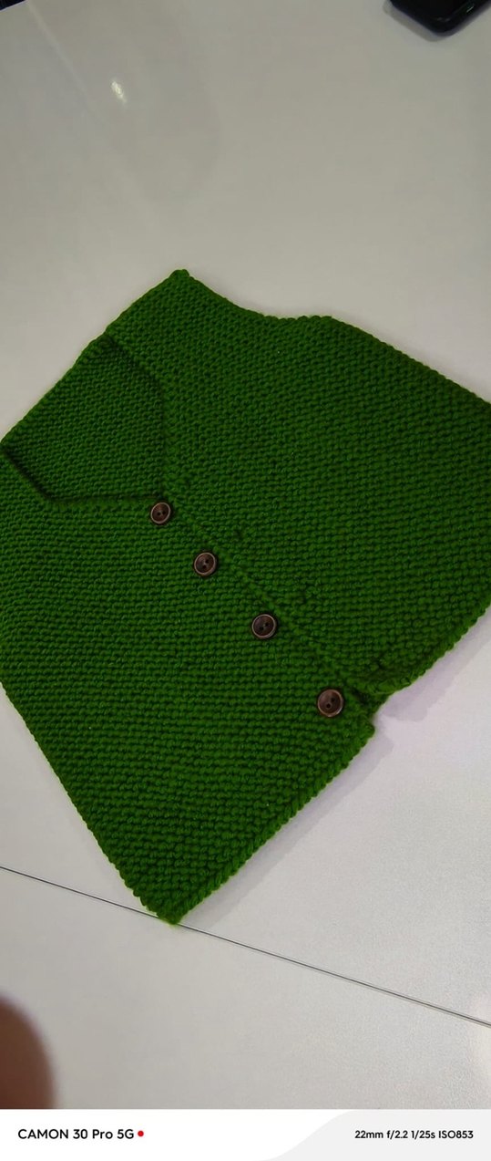 Koyu yeşil renkli, örgü erkek çocuk yeleği, yakası çıtçıtlı ve kolsuz, sade ve normcore tarzda, rahat kesimlidir. 2 yaşa kadar uygundur.
