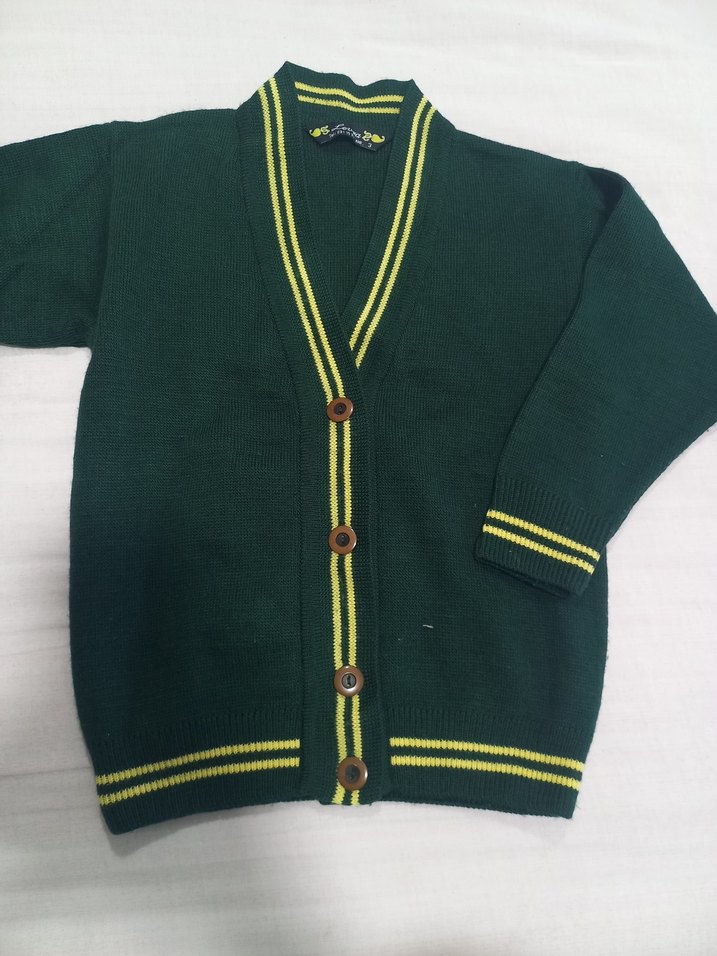 Bu yeşil örgü yün erkek çocuk hırkası, uzun kollu ve renkli çizgili kenar detaylarıyla dar kesimdir. Desensiz ve sokak modasına uygundur.
