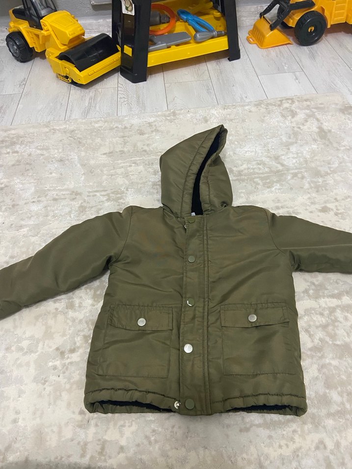 Erkek çocuklar için yeşil sade tasarımlı, kürk detaylı ve yumuşak fleece kumaştan yapılmış, fitted kesim street wear mont. düğmelerde soyulma var