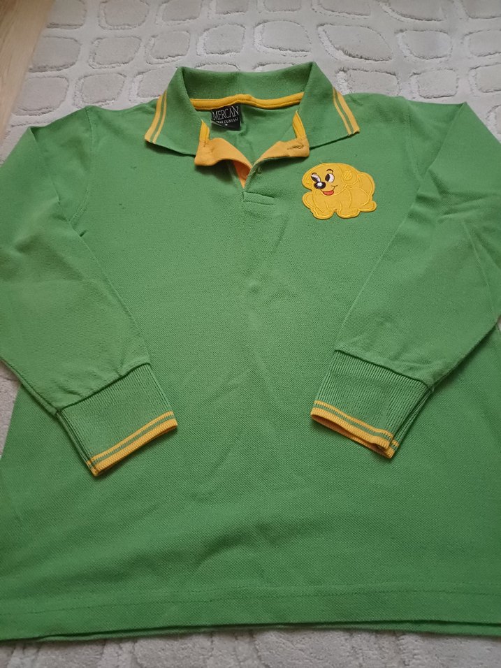 Bu erkek çocuk uzun kollu polo tişört, düğmeli yakaya ve sarı köpek baskısına sahiptir. Rahat kesim, yumuşak ve sıcak kumaştan, canlı yeşil renktedir.