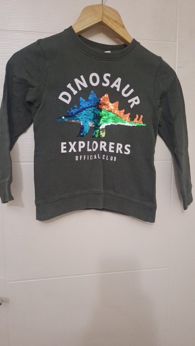 Erkek çocuk için yeşil renkli, uzun kollu, yuvarlak yaka sweatshirt. Renkli payetli dinozor baskısı ve,yumuşak ve sıcak kumaştan üretilmiştir. etiketi mevcut değil ama benim oğlum 7 yaşında giymiştir olmaz ise iade kabulümdür ayrıca dinozor rengi değişmektedir