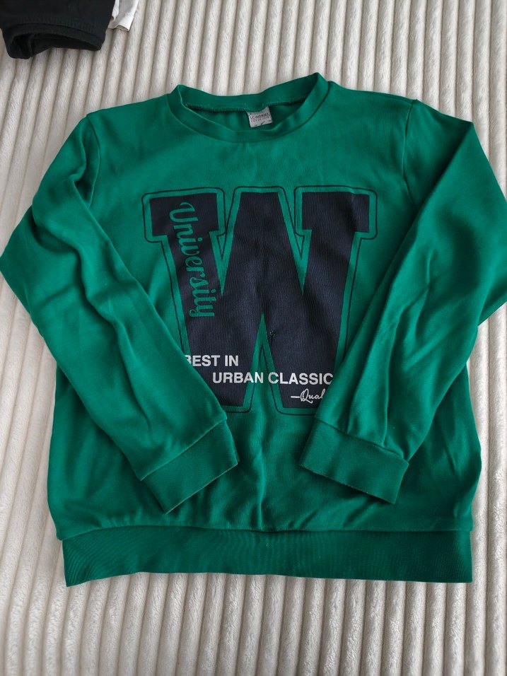 Koyu yeşil uzun kollu, yuvarlak yaka ve bol kesim sweatshirt. Yumuşak sentetik kumaştan, urban classic baskılı. Trend sokak stili için uygun.