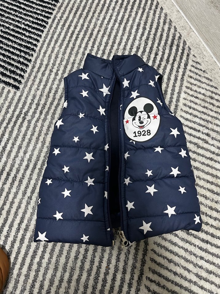 Erkek çocuk için fermuarlı , kesimli ve kesik yakalı, renkli yıldız desenli mavi yelek. Üzerinde "1928" yazılı Mickey Mouse patch'i bulunur. 2 yaş