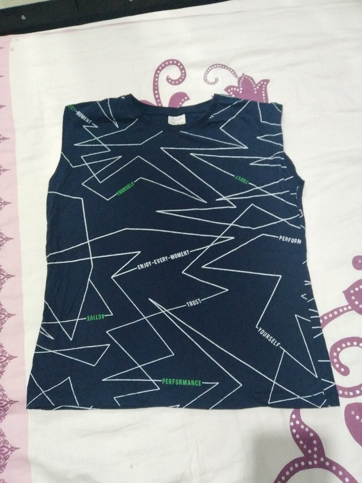Erkek çocuklar için fitted kesim, kolsuz, koyu mavi renkli, soyut baskılı çizgiler ve yazılı yuvarlak yaka tişört. Yumuşak sentetik kumaştan yapılmıştır, günlük sokak stili için uygundur.