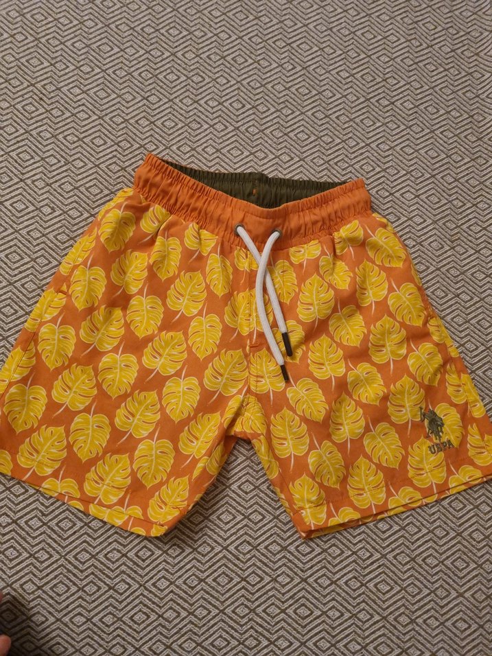 U.S.Polo Ayarlanabilir bağcıklı, sarı yaprak desenli erkek çocuk yüzme şortu. 6-7 yaş için uygundur. Boyu 30 cm , bel genişliği 23 cm , basen genişliği 38 cm dir. 1 kere giyildi herhangi bir deformesi yoktur. Yanlardan ve arkadan ceplidir.