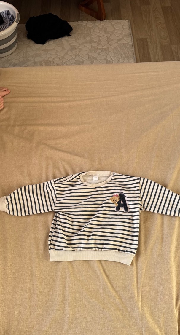 Erkek çocuk için uzun kollu, yuvarlak yakalı, bol kesim triko sweatshirt. Yumuşak kumaştan yapılmış, zebra desenli ve "A" harfi detaylıdır.