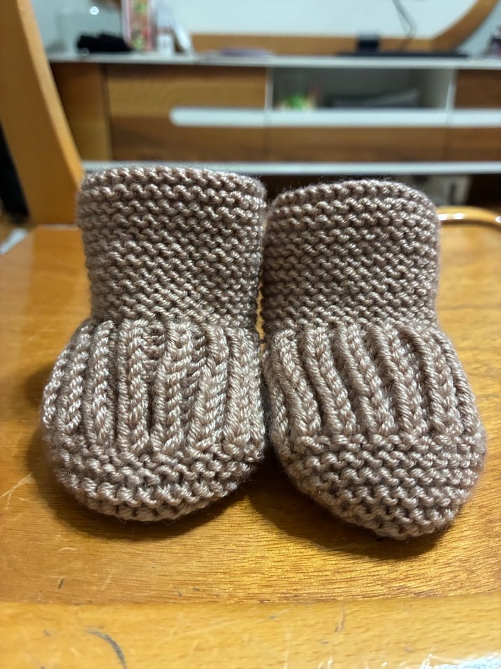 kahve rengi , yumuşak örgüden yapılmışerkekçocuk botları. Düz ve bohem tarzda, küçük ayaklar için rahat ve sıcak tutar.taban ölçüsü 8 santim dir yeni doğan