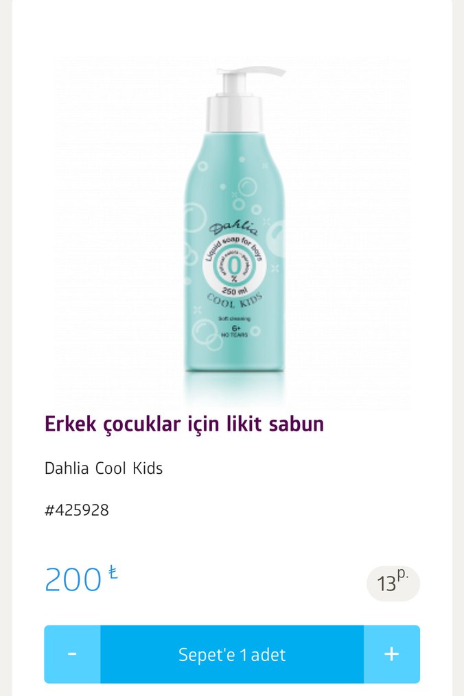 6 + göz yaşartmayan Çocukların hassas cildinin günlük temizliği için özenle seçilmiş bileşenlere sahip sıvı sabundur. Kurumaya karşı koruma için ek olarak gliserinle zenginleştirilmiş formülü ile yumuşak ve canlı görünümü destekler. Kullanım şekli Önerilen Kullanım Şekli: Elinize az miktarda sıvı sabun sıkın, ovun ve ardından suyla durulayın.