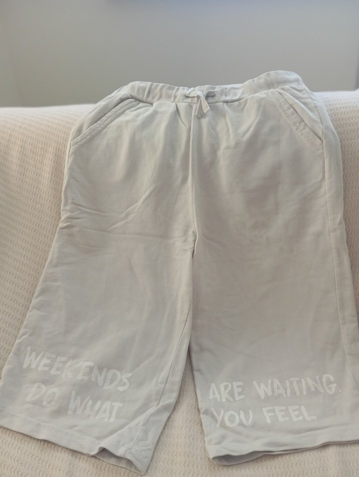 Bej renk ipli, dış mekanlar için rahat ve sokak stili uygun. Üzerinde anlamlı yazılar bulunur. Bel. 31 cm boy. 53 cm 10/11 yaş temizdir