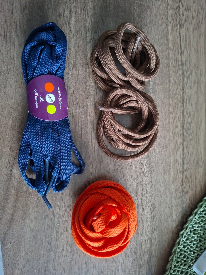 Mavi, kahverengi ve turuncu renklerde erkekler için çok renkli ayakkabı bağcıkları. Dayanıklı malzemeden üretilmiştir.