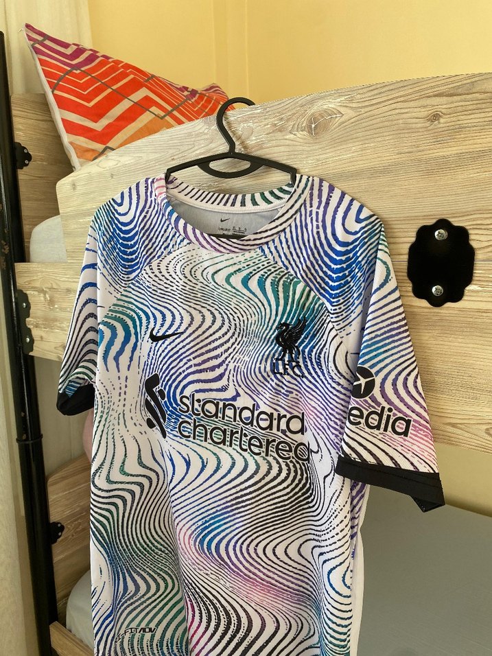 Erkekler için salaş kesim, kısa kollu, bisiklet yaka tişört. Hafif sentetik kumaş üzerinde çok renkli baskılı desen ve drapeli tarzı vardır.