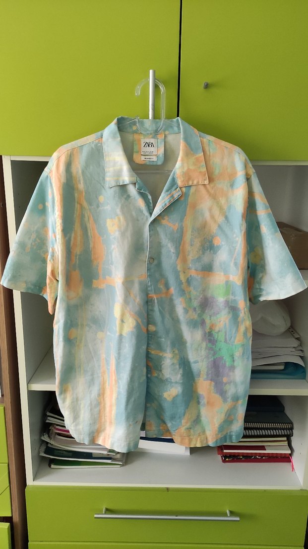 Erkekler için bol kesim, kısa kollu ve yakalı gömlek. Yumuşak keten kumaştan, pastel çok renkli batik desene sahip, düğmeli ve günlük sokak stili için uygun.