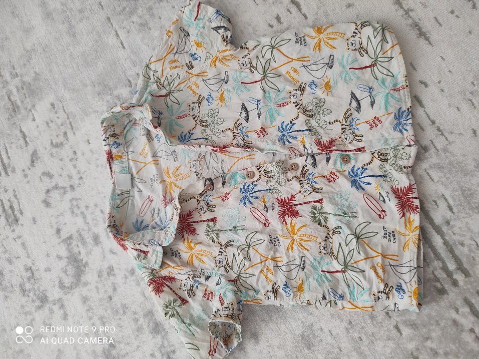 Erkek çocuklar için bol kesim, kısa kollu, çok renkli baskılı tekstil gömlek. Yaka düğmeli, bohem tarzda.