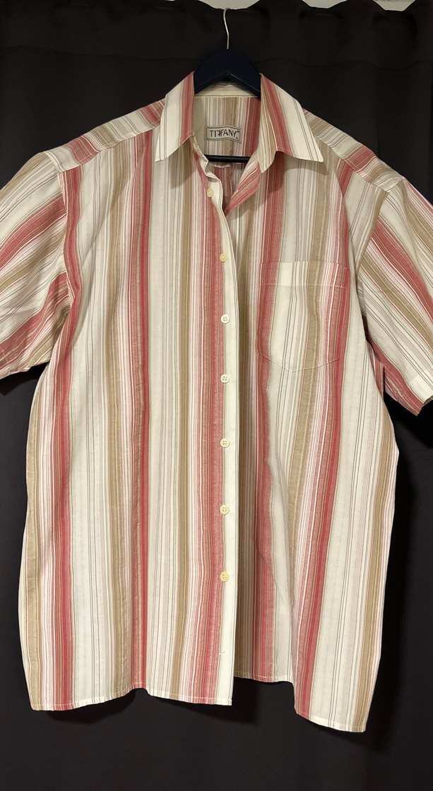 Erkekler için çok renkli çizgili, kısa kollu, düğmeli, pamuklu kumaştan yapılmış, rahat kesim gömlek. Ofis kullanımı için uygundur.
