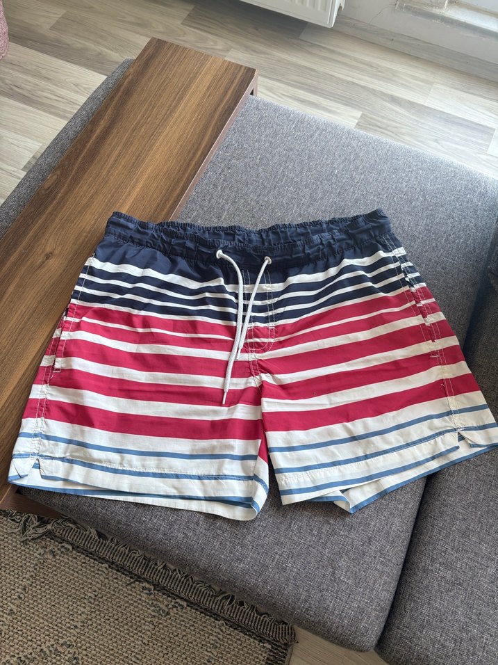 Erkekler için çok renkli çizgili, kısa ve vücuda oturan mayo. Belinde bağcıklı, plaj ve gündelik kullanım için uygun tarzda. 2 adet, tertemiz. Bel 40, boy çizgili 37, mavi 40. #erkek #mayo #şort