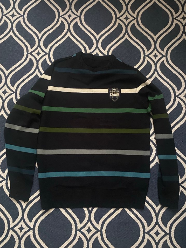 Erkek için uzun kollu, bisiklet yaka ve fitted kesim. Yumuşak ve sıcak dokulu triko, çok renkli çizgili baskı ile trend sokak stili sunar.