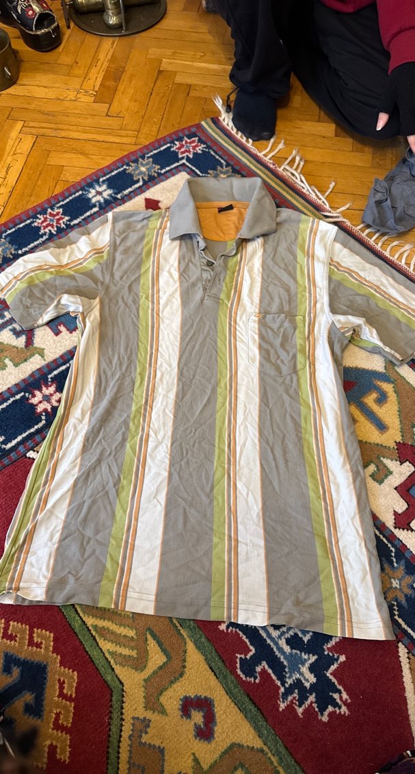 Erkek çok renkli, kısa kollu polo tişört, düğmeli yakaya ve normal uzunlukta bol kesime sahiptir. Gri ve çok renkli çizgili deseniyle günlük kullanıma uygundur.