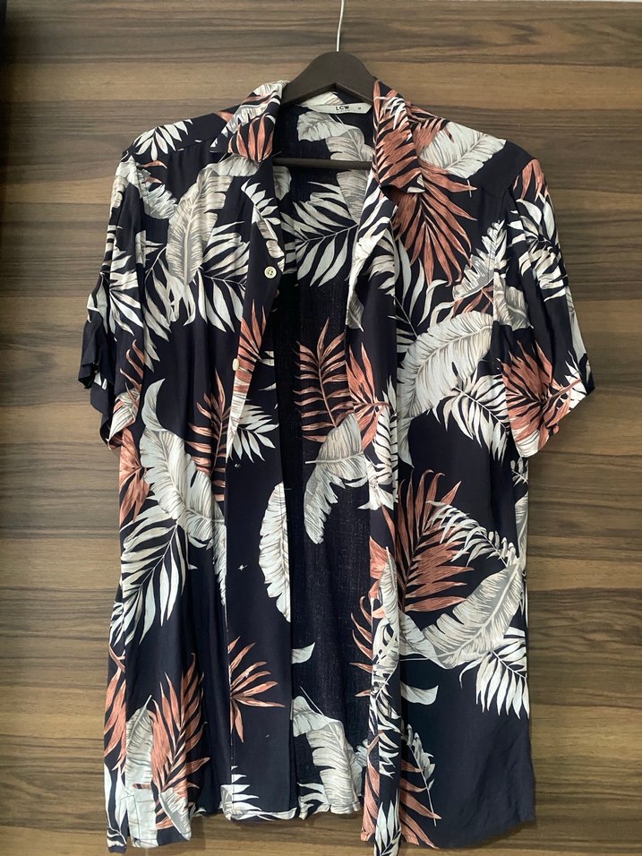 Erkekler için kısa kollu, bol kesim, V yaka gömlek. Koyu çok renkli batik desenli, düğmeli ve sentetik kumaştan üretilmiştir. Rahat sokak tarzı için uygundur.