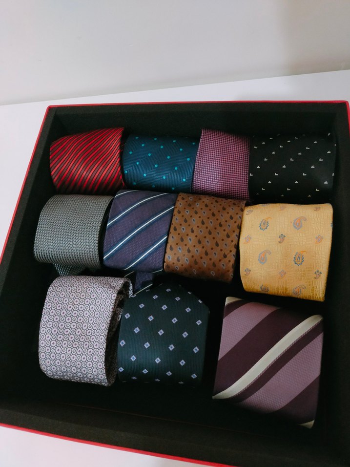 Erkekler için koyu tonlarda çok renkli desenlere sahip kravat seti. Çizgili, puantiyeli ve paisley desenler içerir tanesi
