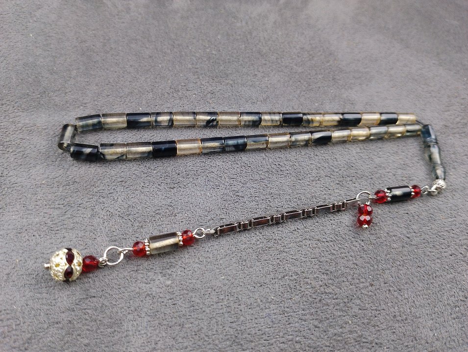 Çok renkli ve gri tonlarda vintage tarz erkek tesbih, konvansiyonel tasarım ve kırmızı detaylarla tamamlanmıştır...Usta işçilikli on numara beş yıldız üst düzey KOLLEKSİYONLUK çekim harikası özel döküm sıkma kehribar tesbih kesme model bilek boy 5*8*mm ölçü çok özel tasarım harikası kaplama püsküllü günlük kullanıma uygun çok memnun kalacağınız güzel bir üründür
