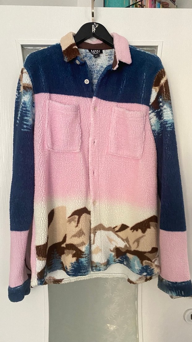 Erkekler için pastel tonlarda çok renkli tie-dye desenli, düğmeli, uzun kollu, yakalı ve bol kesim yumuşak polar gömlek.