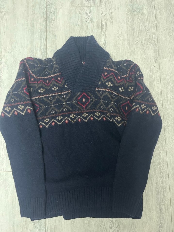 Erkekler için yün örme, yüksek yakalı, çok renkli desenli, normal uzunlukta ve dar kesim kazak. Günlük sokak stili için uygun.